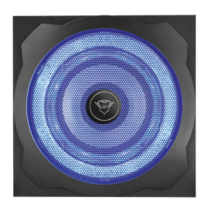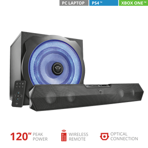 The sound is complemented by refined design. The Trust GXT 668 with pulsating LED illumination on the subwoofer easily fits under any PC screen or living room console set-up. Whether watching TV or playing on your PC or console, any device with an optical (SPDIF) or 3.5mm audio output can be connected.