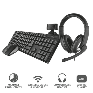 With the Trust Qobi 4-in-1 Home Office Set you have everything you need for a seamless work-from-home experience. This set includes the Trino HD Webcam, the Reno Headset and the Ximo Wireless Keyboard and Mouse Set. Four items that will make working from home a breeze.